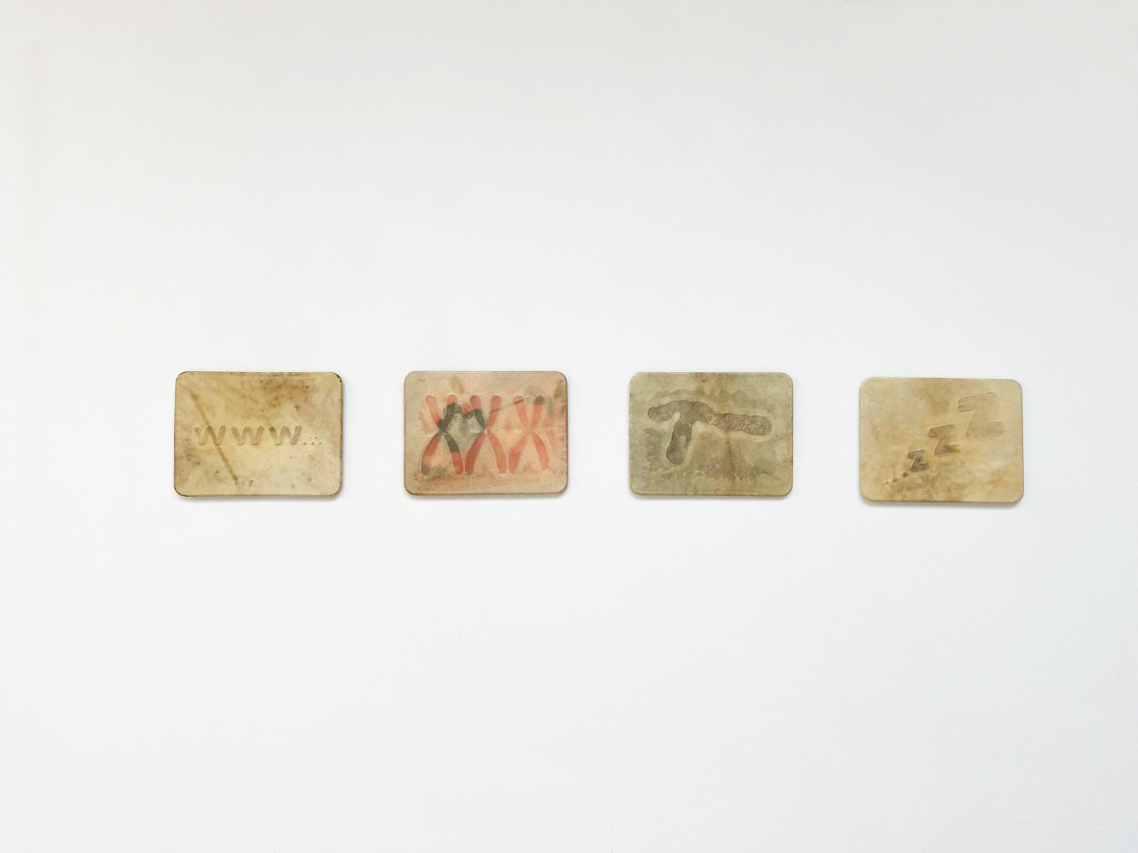 Embossed rawhide, pressed flowers, painted canvas, printed canvas.