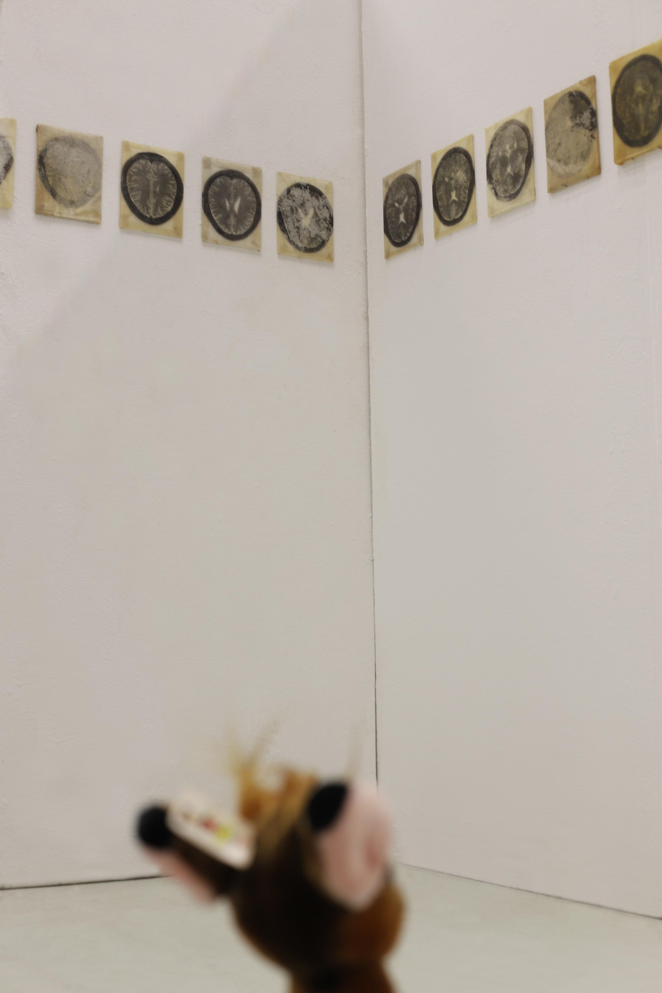 Silkscreened MRIs on rawhide and a stuffed Bambi